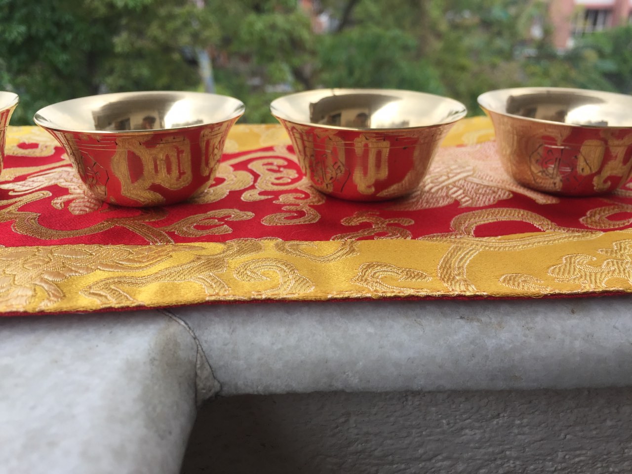 Beautiful set of medium sized 7 brass offering bowls. handmade in nepal. these bowls are placed on shrine and filled with water daily as a way of accumulating virtue and merit.