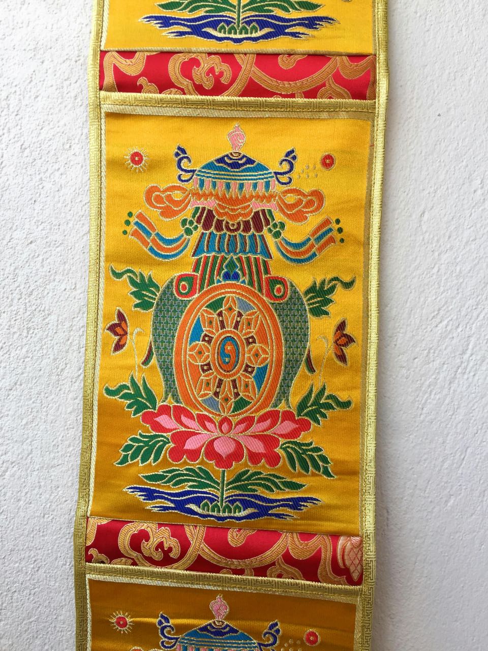 it's handmade in our Nepal workshop with tibetan traditional design silk brocade with eight auspicious symbol on it.