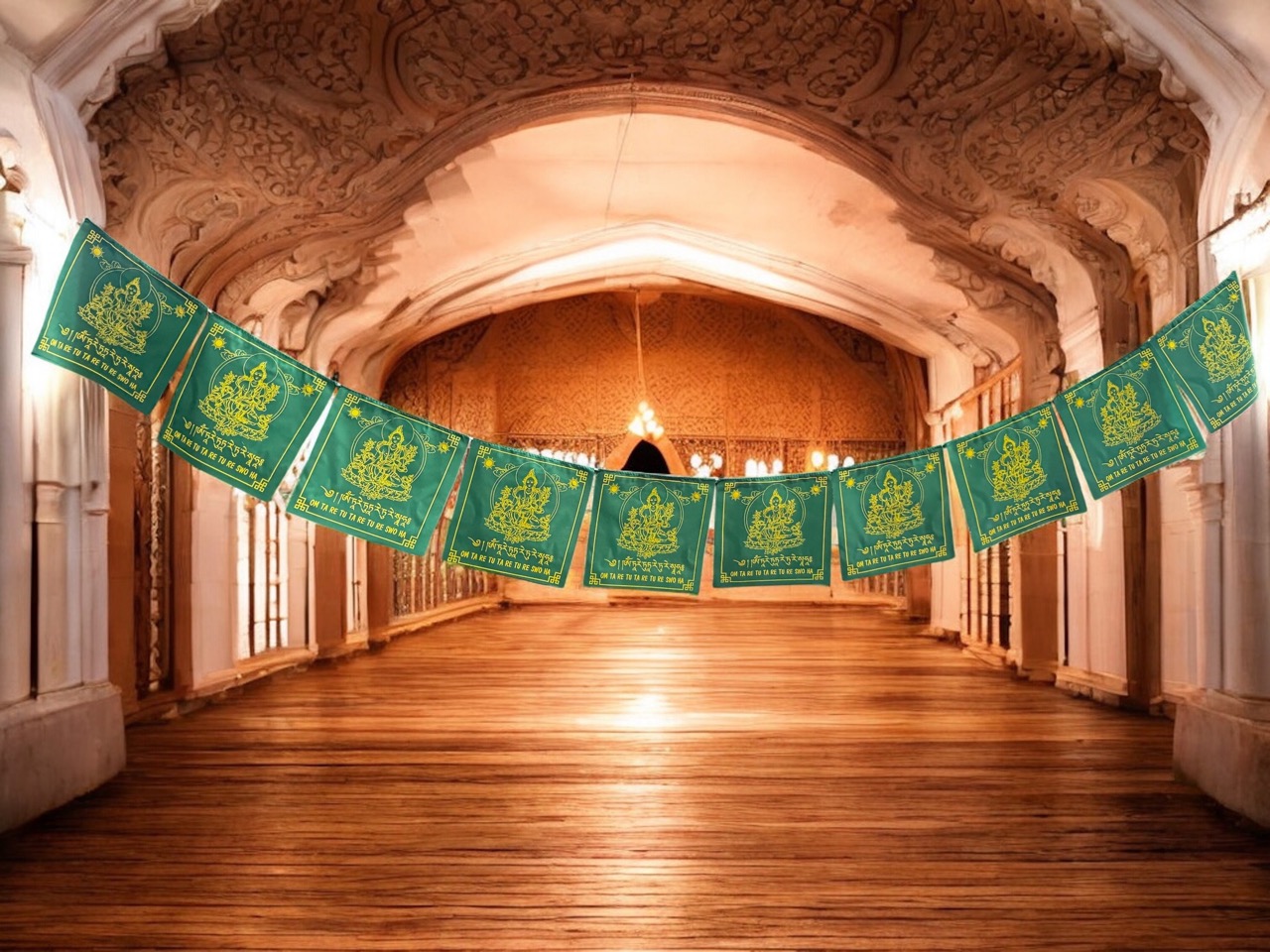 These Tibetan Buddhist Green Tara prayer flags are made in Nepal from soft terry cotton fabric, providing a comfortable and durable feel. Fully green in color, each flag features screen-printed designs with mantras written in both English and Tibetan, offering spiritual support and blessings. Perfect for creating a serene and uplifting atmosphere in your home or sacred space.