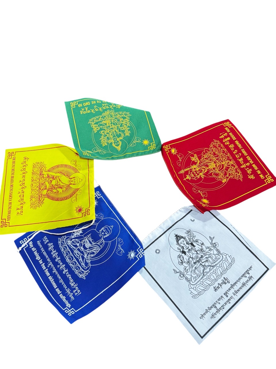 These Tibetan Buddhist prayer flags feature a harmonious blend of revered deities including Medicine Buddha, Chenrezig, Guru Rinpoche, Green Tara, and Shakyamuni Buddha. Screen printed on soft terry cotton fabric, each flag carries blessings and spiritual energy. Crafted with care in Nepal, they are designed to inspire peace, healing, and compassion in your surroundings. Perfect for enhancing meditation spaces or sacred areas, these flags support your spiritual journey with authentic symbolism and quality craftsmanship.
