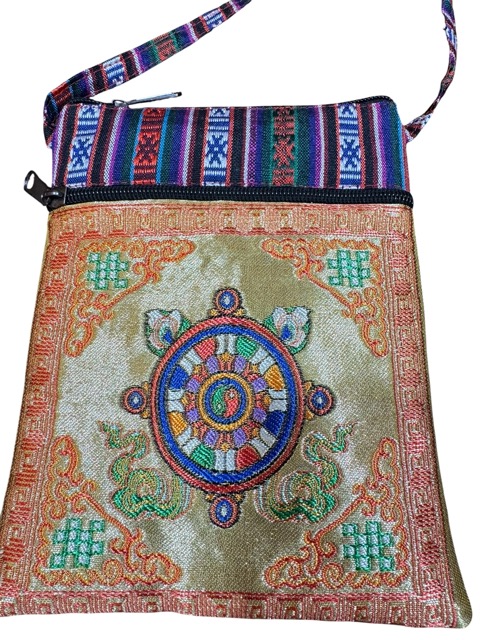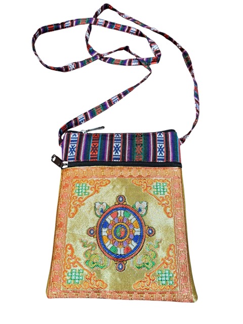 This handmade Tibetan Buddhist crossbody bag features the intricate Wheel of Life design on luxurious golden silk brocade, combined with traditional Bhutanese cotton fabric. Crafted in Nepal, it offers two secure zippered compartments to keep your belongings safe and organized. Perfect for carrying essentials with a meaningful touch, this versatile side sling or monk bag supports your spiritual journey while providing practical everyday use.